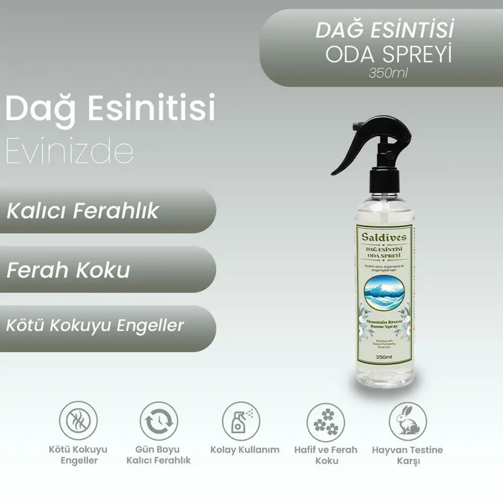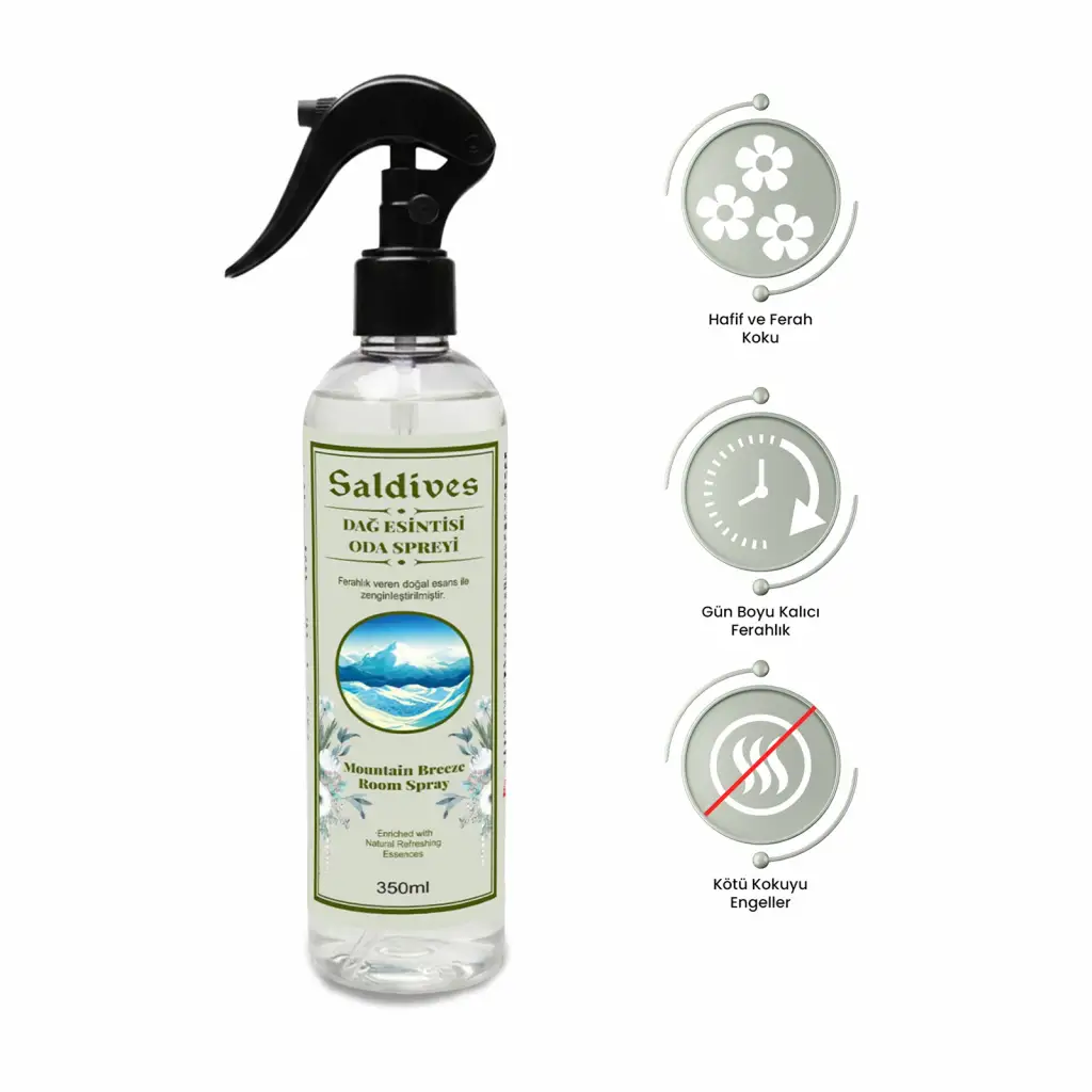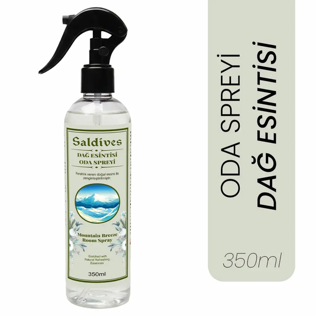 Dağ Esintisi Oda Spreyi 350 ml, Saldives markasının özel bir ürünüdür. Evinizde doğanın tazeliğini hissetmek istediğinizde tercih edebileceğiniz bir oda spreyidir. Sağladığı ferahlık ve hoş koku ile ortamınıza keyifli bir atmosfer katar.
