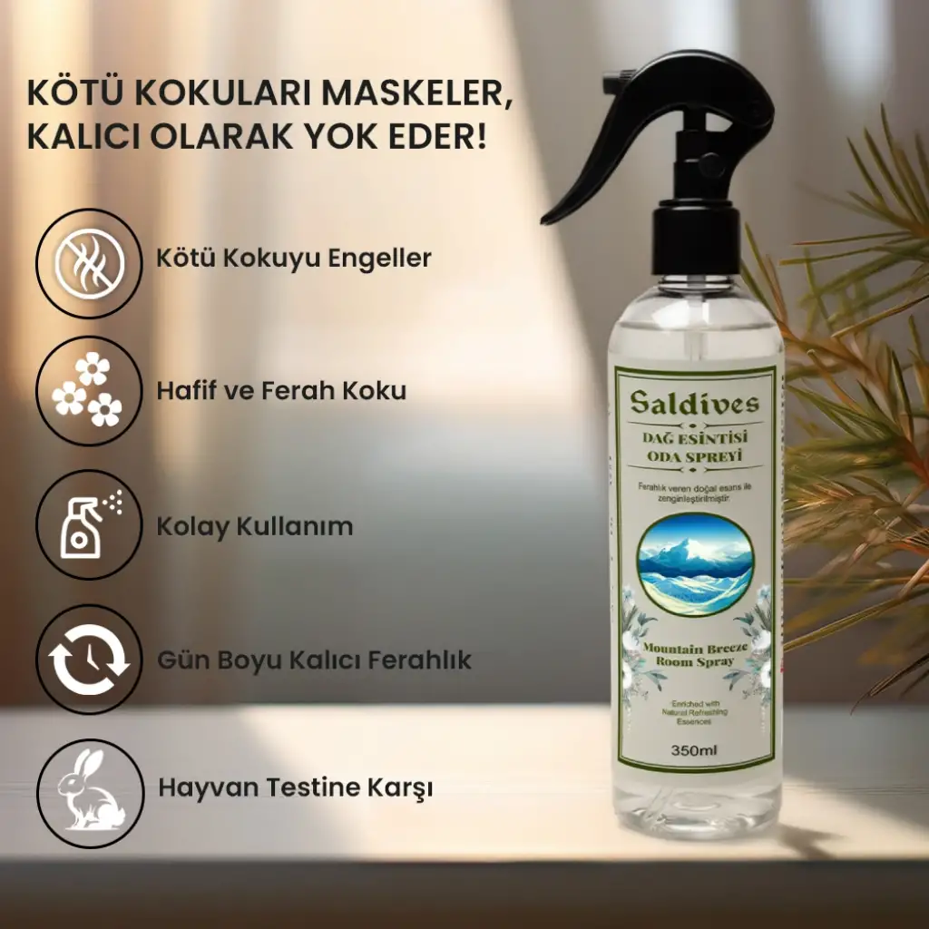 Saldives Dağ Esintisi Oda Spreyi, dağ havasının ferahlığını yaşam alanlarınıza taşır. Temiz, serin ve canlandırıcı kokusuyla ortam havasını anında yeniler.