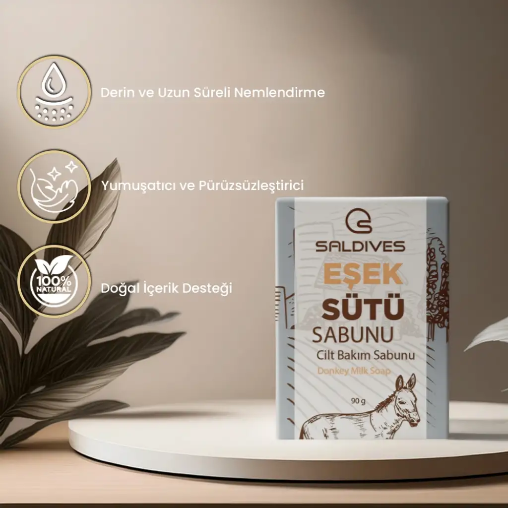 Eşek Sütü Güzellik Sabunu, doğal ve etkili formülü ile cildinize ipeksi bir dokunuş sağlar. Saldives markası tarafından özel olarak üretilen bu 90 gramlık katı sabun, cildi beslerken nemlendirir ve canlandırır.