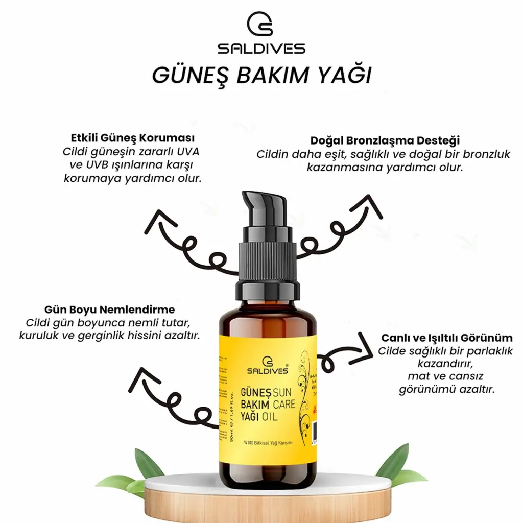 Saldives Güneş Bakım Yağı 50 ml, cildinizi güneşin zararlı etkilerinden korurken aynı zamanda besler ve nemlendirir.