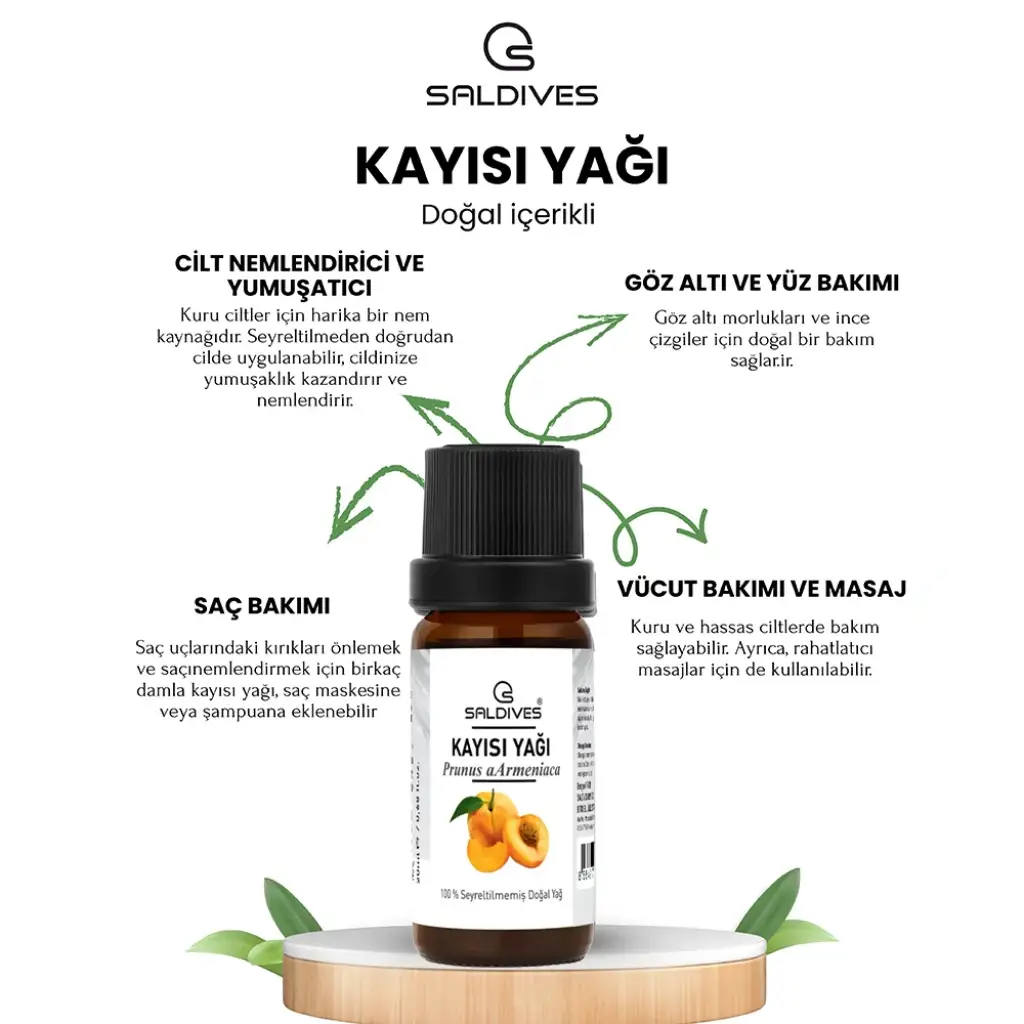 Saldives Kayısı Yağı, kayısı çekirdeklerinden elde edilen hafif ve besleyici yapısıyla cilt ve saç bakımında kullanıma uygundur. Cildi yumuşatmaya ve nemlendirmeye yardımcı olur.