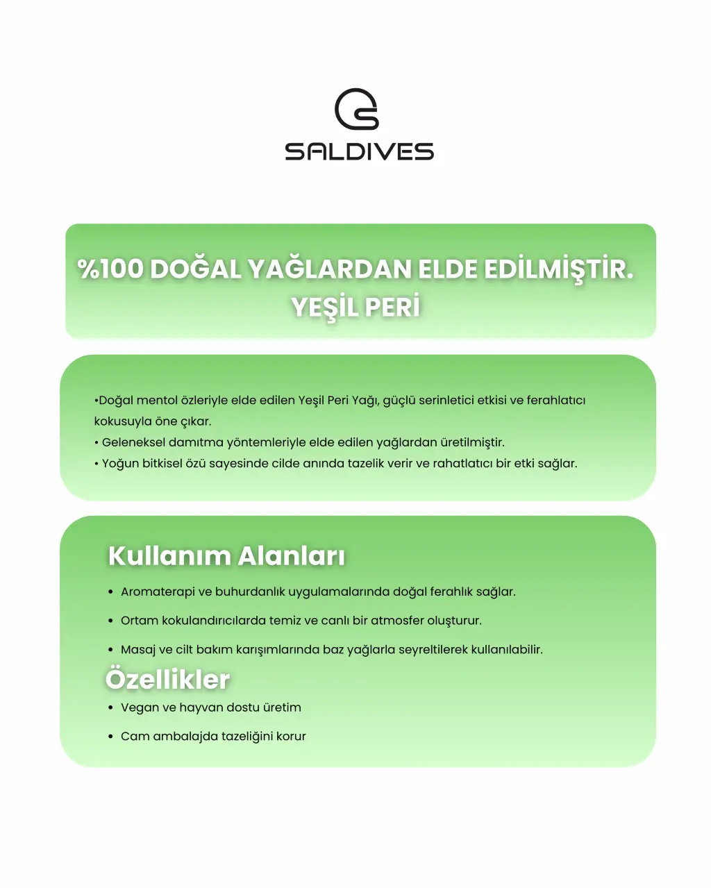 Saldives'in Yeşil Peri 20 ml masaj yağı, doğal bileşenleriyle cildinizi besler ve rahatlatır.